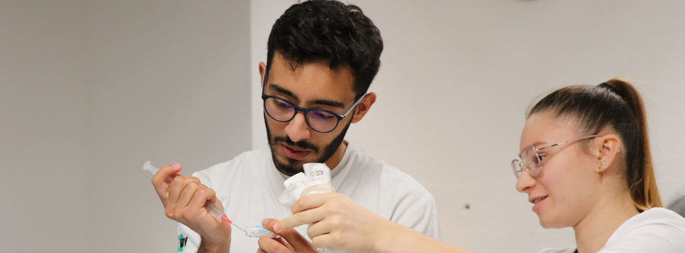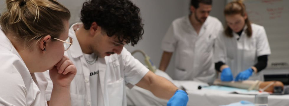 En collaboration avec le GIS ( groupe interprofessionnel de santé), nous échangeons nos connaissances en pose de voies veineuses et en suture avec les étudiant.e.x.s en soins infirmiers.